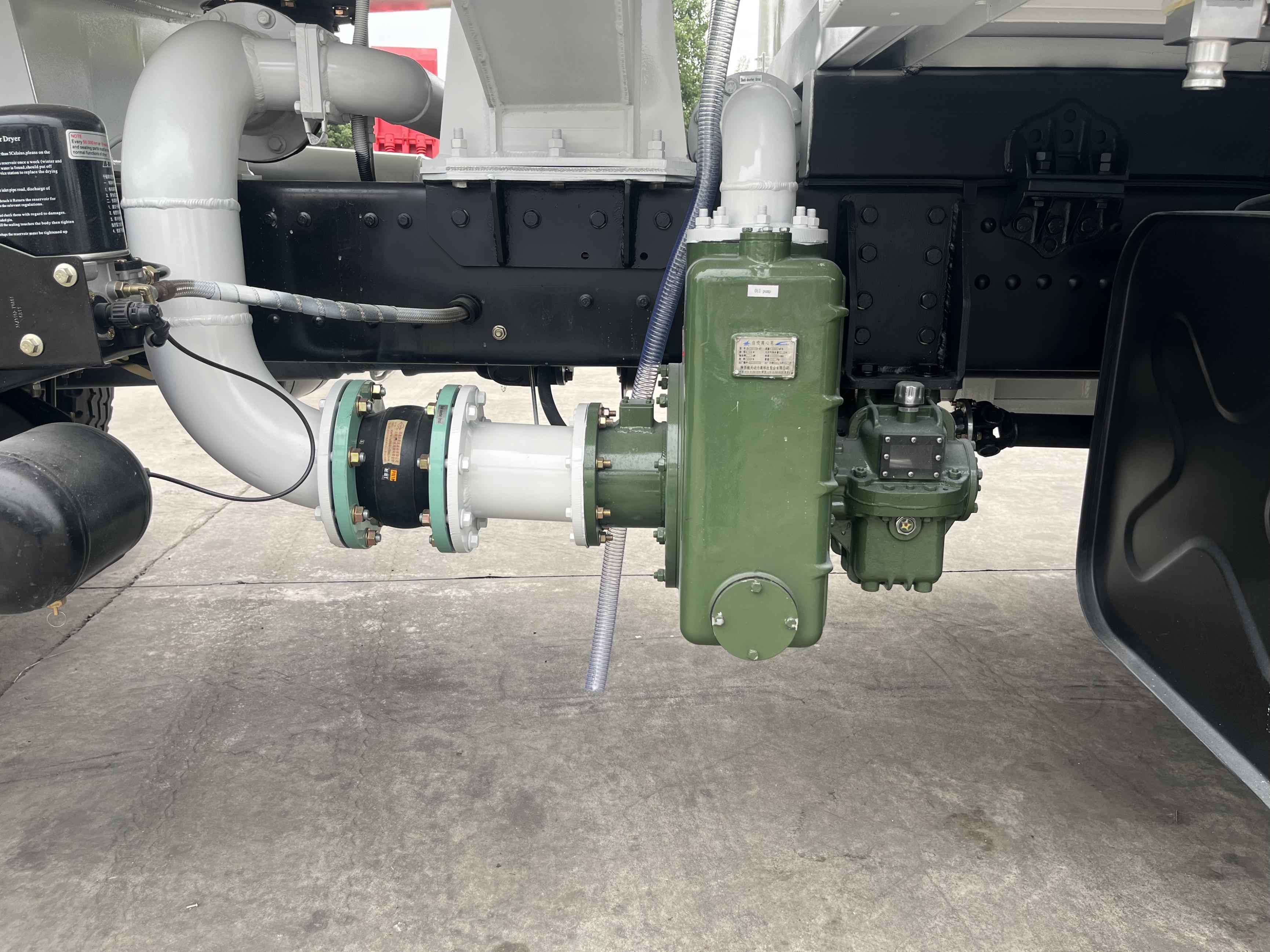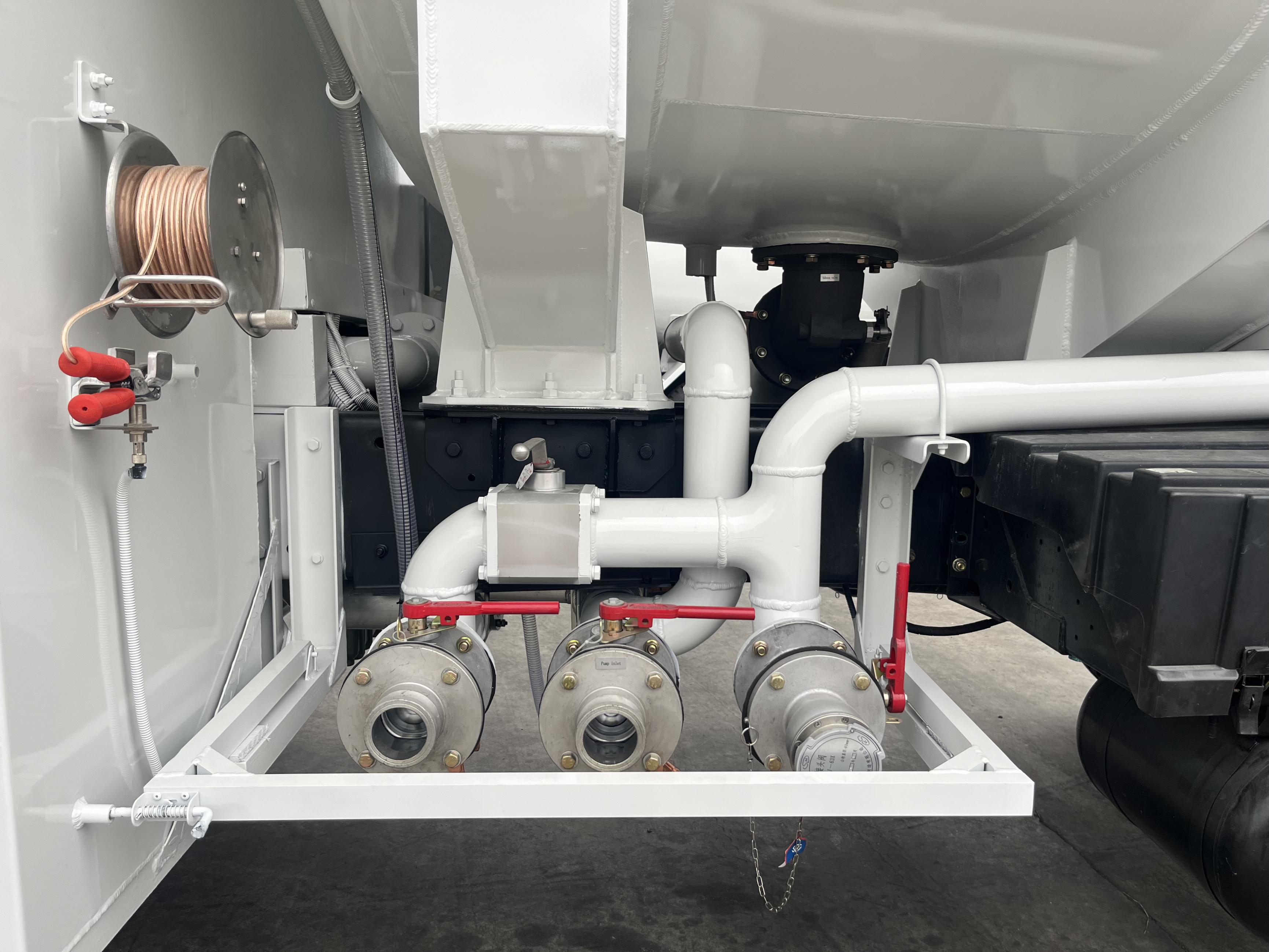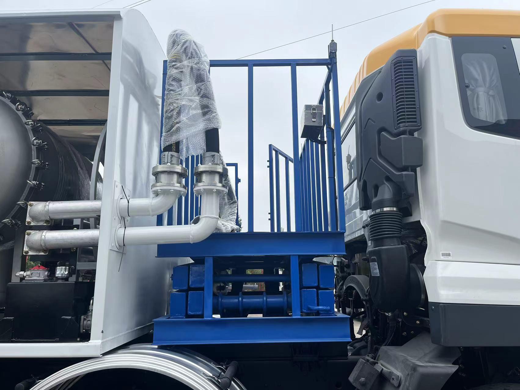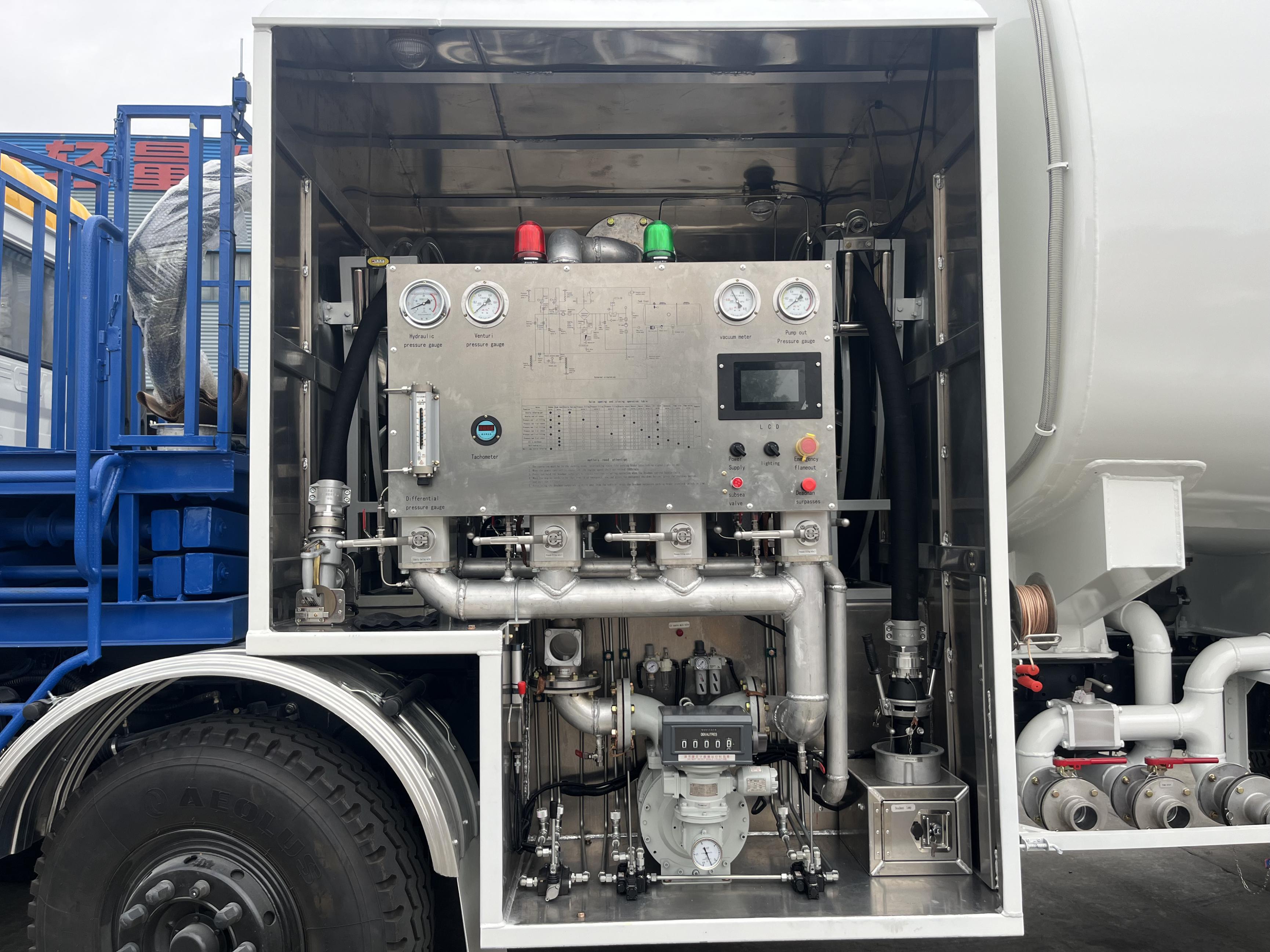 罐体 5.6mm,封头 5.7mm,隔板 5.7mm,单仓,加油车专用枪一套 DN38 液压卷盘 20 米流量≥350L/min,[选装 DN50 液压卷盘 20 米流量≥ 500L/min];专用 DN65 液压卷盘 20 米配两个航空稳压接头(单管流量 ≥1200L/min),带大字码流量计 0.2 级精度;防爆灯;带聚结分离器 (150F/小时);自吸式离心泵(泵进泵出)带副传动轴驱动液压站; 6 寸浮球液位计;左右两侧各一件 HYJ-63X 接头阀,弹性软连接;操作 设备箱:远程磁控开关,手油门(含气缸);DeadMan 控制系统;管内 压力控制阀;文氏管,高液位控制阀,磁控加油程控器。真空表、压 力表、压差计,文丘里压力表、液压压力表。过滤器前/后/排污取样(闭 路取样器);并自制取样回收筒。[选装设备舱与驾驶室之间加装液压 升降平台,平台上方配有 2 套 4 米 DN65 软管(不锈钢旋转接头连接) 含稳压接头阀及 2 个文氏管,配备距离传感器],罐顶铺防护网,带活 动护栏,罐体内/外爬梯;卸料箱 2 件/工具箱/操作设备箱各一件;单 桥板折挡泥板 2 套,侧防护/后防护/管道/球阀/垫片/螺栓配齐;其他 附件厂标;罐内钝化处理,表面清洗干净,标识/反光贴按照厂标。