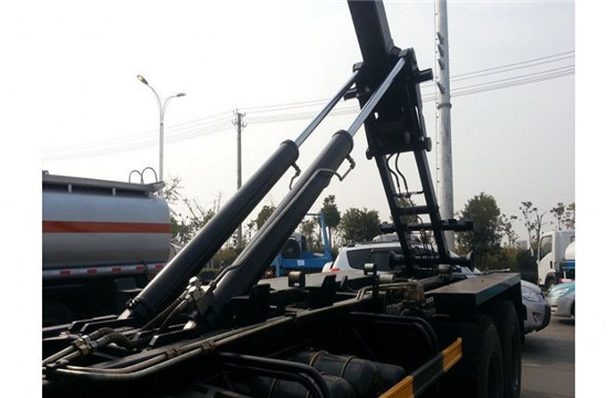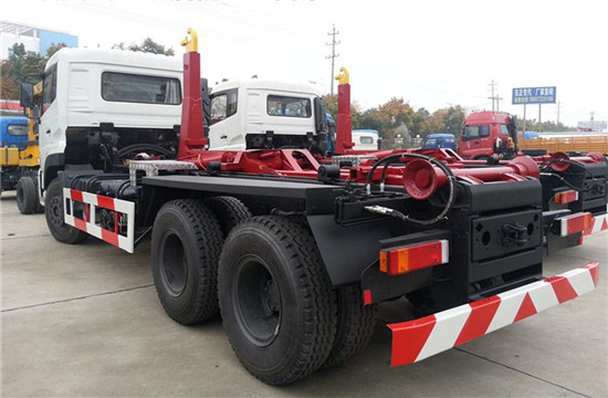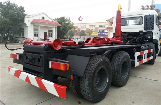 在东风二类底盘基础上通过加装取力器,由底盘的变速箱对液压的操作系统进行力量的传输,双液压缸带动底盘上主钩臂完成对垃圾箱的举升和落下作业。在箱体右侧安装挂桶提升机,对挂桶进行放下和提升作业,垃圾车箱体采用优质武钢碳钢材料制作而成,垃圾箱的底部材料厚度为8毫米,垃圾箱的四周为6毫米厚度,垃圾箱容积为20到30方,垃圾箱可采用碳钢、不锈钢、内部采取环氧树脂防腐处理等材质,垃圾桶可选用塑料、不锈钢、碳钢材料等,垃圾桶容积:120升、240升、360升等。垃圾箱的后部有可供开启的后门,带密封功能,防止流形垃圾污染环境。开启式后门在垃圾收集满后,在卸载垃圾的时候能够快速的倾倒垃圾,节省作业时间。操纵系统选装在驾驶室内部和车体前部,更加干净方便。可根据客户需求对垃圾箱的材质和材料厚度进行改装。