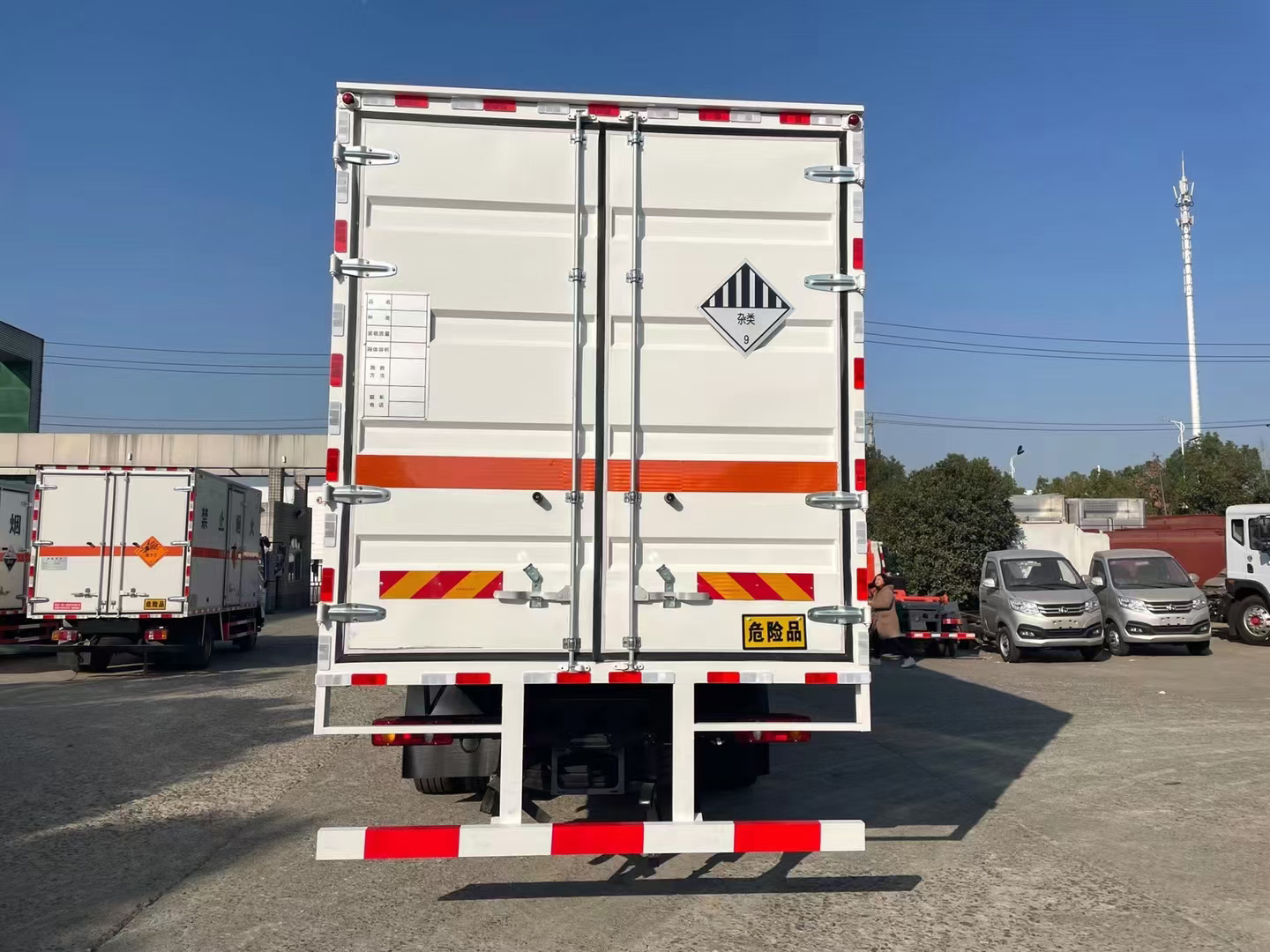 | 整车说明: | EBS型号/厂家:EBS5/东科克诺尔商用车制动系统(十堰)有限公司;安装有限速装置;限速装置限速(km/h):80;安装有具有卫星定位功能的行驶记录仪;发动机净功率值:B6.2NS6B230(166kw),B6.2NS6B245(177kw);选装描述:随底盘选装驾驶室,选装前围和灯具。选装侧门型式及位置,选装不开侧门,厢体侧面板选装开百叶窗,选装瓦楞板结构;发动机/油耗值(L/100km)对应关系为:B6.2NS6B230(36.1),B6.2NS6B245(36.1);侧后防护情况:左右侧面及后下部防护材料:Q235B碳钢,连接方式:左右侧面及后下部防护均采用焊接连接,后部防护断面尺寸(mm):140×70,后部防护离地高度(mm):480;车厢顶部封闭且不可开启;运输独立容器(瓶)包装的货物;危险货物类项号:9;其他说明:该车适用于运输危险品。该车型可选装ETC车载装置。仅采用底盘子午线轮胎和带ABS的底盘,该车前轮安装盘式制动器,前置排气管,转向轮安装轮胎爆胎应急防护装置,该车后轴为采用空气悬架。整车长/轴距/前悬/后悬对应关系为(mm):11000/1995+5000/1430/2575; | ||