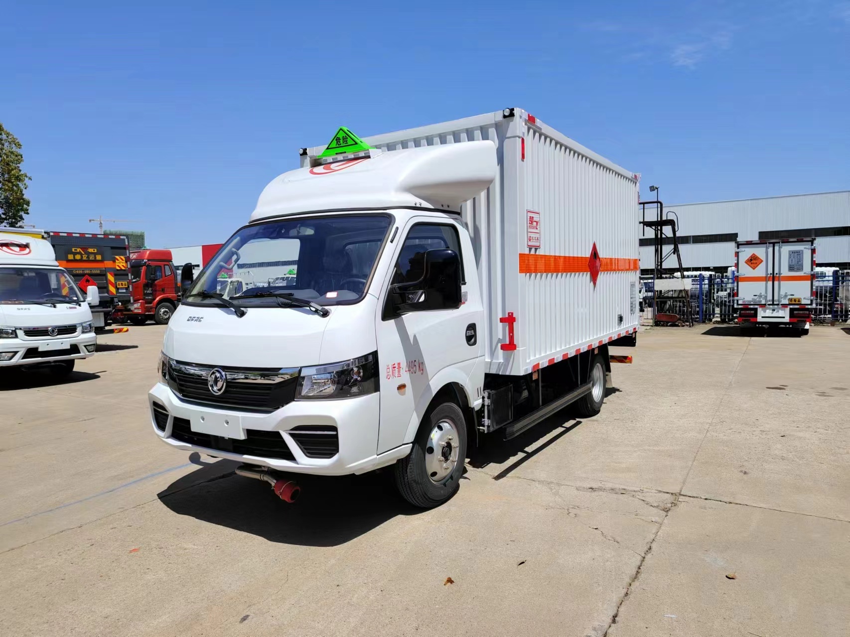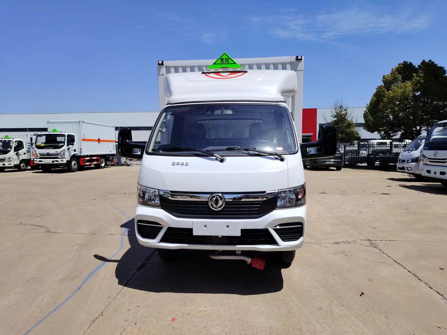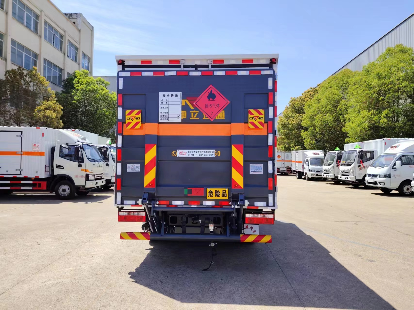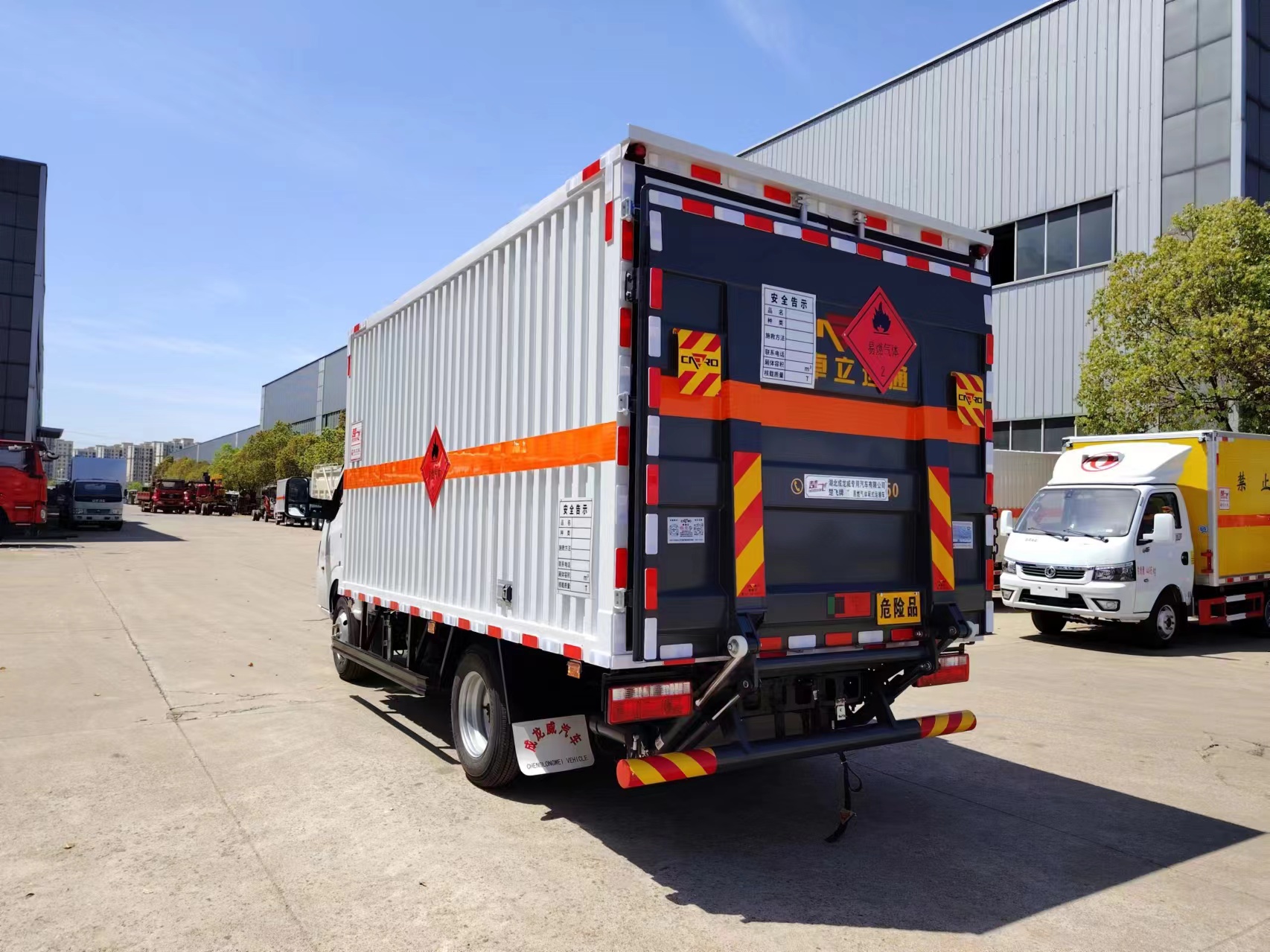 瓦楞箱体:瓦楞结构箱体(冷轧钢板压瓦成型),瓦楞 1.2mm,货厢底板 3mm 花纹板(板上铺防静电胶皮), 底板横梁加密,右侧边加装 1 个单开侧门(选装双开侧门),门锁为镀锌锁件,货厢内部两侧安装固定运载物的卧环,货箱内部带防燃烟雾报警器,门框加装防盗报警感应器。整车国标反光标示及警告标志 (随车工具,灭火器,三角顶灯,危险品标识,拖地静电带,),其他按照公告标准制作。