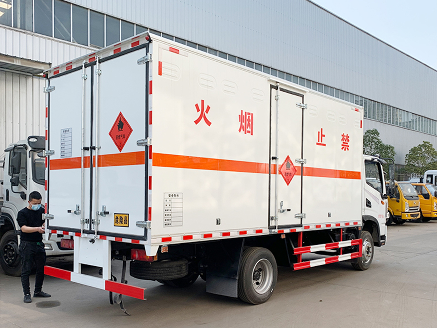 | 整车说明: | 该车主要用于运输独立容器包装的易燃气体,非易燃无毒气体.类项号为2.1,2.2;运输易燃气体时挂2.1类警示牌,运输非易燃无毒气体时挂2.2类警示牌;厢体顶部封闭,不可开启;.ABS生产厂家/型号:3631010-C2000/东科克诺尔商用车制动系统(十堰)有限公司,J ABS/焦作博瑞克控制技术有限公司;发动机与油耗值(L/100Km)对应关系为:YCY30165-60/19.7;侧后防护材料:Q235,连接方式:焊接,后部防护断面尺寸(mm):120×45,后部防护离地高度(mm):460,该车安装带有卫星定位功能的行驶记录仪;装备限速装置,限速80km/h;前轴装备盘式制动器;排气管前置.仅选用3800mm轴距,子午线轮胎.转向轮安装轮胎防爆应急防护装置.样车装配液压升降尾板,尾板收起状态水平长度为250mm,尾板质量为450kg.该车型可选装直接供电ETC车载装置.选装侧门样式及瓦楞工艺厢体,选装后门样式;选装不带液压升降尾板结构时:后防护材料:冷弯型钢/Q235,连接方式:焊接;断面尺寸(mm):120×50;后部防护离地高度(mm):480;选装圆形截面后防护,连接方式:螺栓连接,后部防护断面尺寸(mm):φ120,后部防护离地高度(mm):430;;随底盘选装驾驶室. | ||