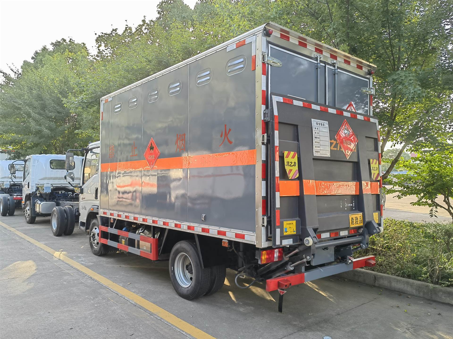 | 整车说明: | 该车为危险品运输车.厢体顶部封闭,不可开启.类项号:3.随底盘选装驾驶室.选装侧开门型式及位置,选装不开侧门,厢体选装开百叶窗.液压尾板收起水平长度:280mm,尾板质量为350kg,后部安装液压尾板时侧、后防护材料为Q235,侧防护焊接连接,后防护螺栓加焊接连接,后防护截面高100mm,截面宽50mm,下边缘离地高460mm;选装后部不带尾板时后防护材料:Q235,连接方式为焊接,后防护截面高100mm,截面宽50mm,下边缘离地高460mm.仅采用排气管前置,子午胎,限速装置,辅助制动装置和前轮盘式制动器的底盘;限速80km/h.安装具有卫星定位功能的行驶记录仪;ABS系统型号为XH-KQ4S4M-E01,生产企业为广州市西合汽车电子装备有限公司;型号为CM4XL-4S/4M,生产企业为广州瑞立科密汽车电子股份有限公司;型号为VIE ABS-Ⅱ,生产企业为浙江万安科技股份有限公司. 仅选用发动机D25TCIF1/WP2.3NQ130E61/D30TCIF1/NV30-C6B/WP3NQ160E61油耗值为11.06,10.18,11.34,11.38,10.48(L/100km).转向轴已安装防爆胎装置.选装ETC车载装置. | ||