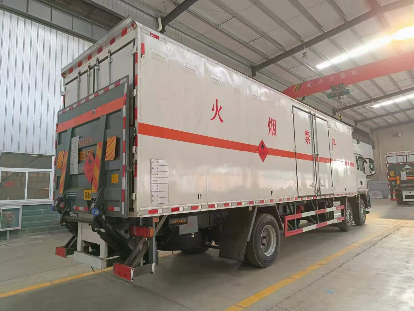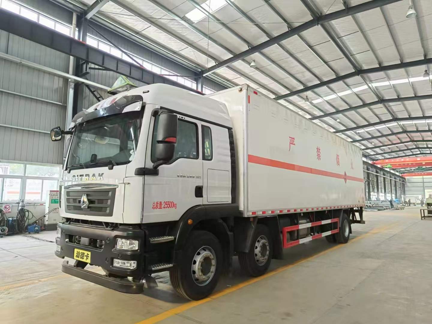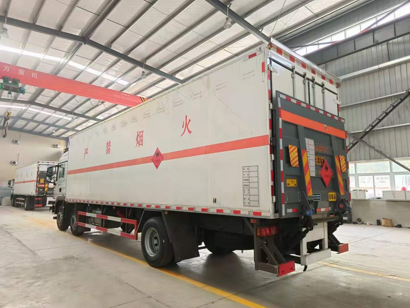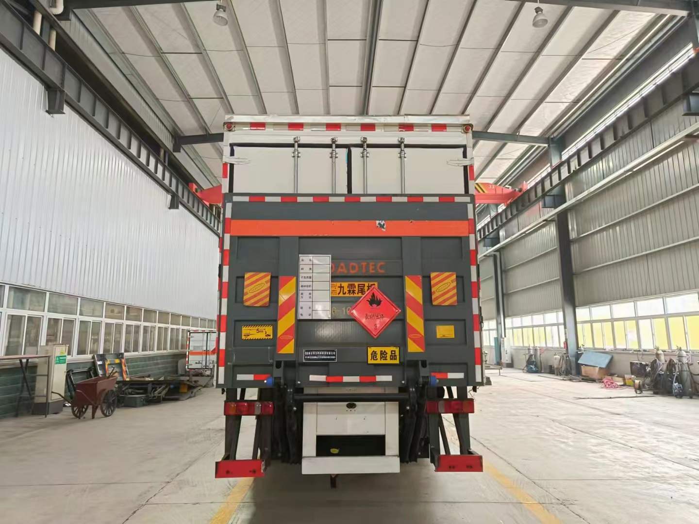 | 整车说明: | 该车为危险品运输车.该车顶部封闭,不可开启.随底盘选装驾驶室;运输具有独立容器(瓶)包装的物品.类项号:3.后部安装液压尾板,液压尾板收起水平长度300mm,尾板质量为550kg.侧、后防护材料:Q235,连接方式均为焊接连接,后防护截面高120mm,截面宽50mm,下边缘离地高490mm;选装后部不带尾板样式时后防护装置材料:Q235,连接方式为焊接,后防护截面高120mm,截面宽50mm,下边缘离地高490mm.选装侧开门型式及位置;厢体选装开百叶窗,选装后部样式.仅采用排气管前置,子午胎,限速装置,辅助制动装置和前盘制动器的底盘;限速80km/h.安装具有卫星定位功能的行驶记录仪;EBS系统控制器生产企业/型号为威伯科(上海)管理有限公司/EBS3.发动机型号及油耗值(L/100km)对应关系为: MC07.25-60/32.43,MC07.27-60/32.43,MC07.31-60/32.43,MC07H.35-60/32.45,WP7H220E62/32.15,WP7H245E62/32.15,WP7H270E62/32.15,WP7H300E62/32.06,WP7H320E62/32.06.后轴仅采用空气悬架.转向轮装备轮胎爆胎应急防护装置.选装ETC车载装置.发动机净功率值:185kW(MC07.25-60),199kW(MC07.27-60),225kW(MC07.31-60),254kW(MC07H.35-60),157kW(WP7H220E62),175kW(WP7H245E62),194kW(WP7H270E62),216kW(WP7H300E62),230kW(WP7H320E62). | ||