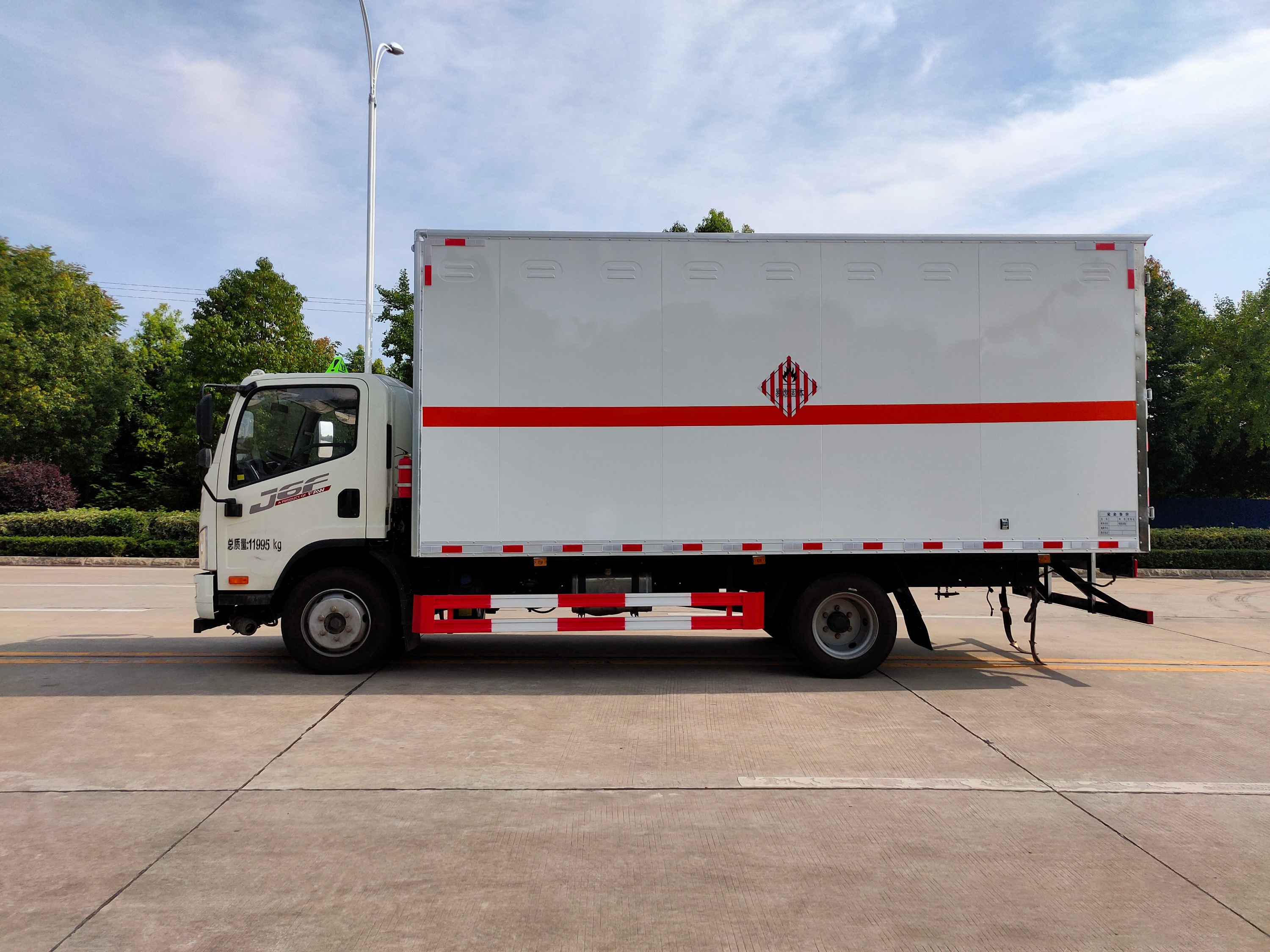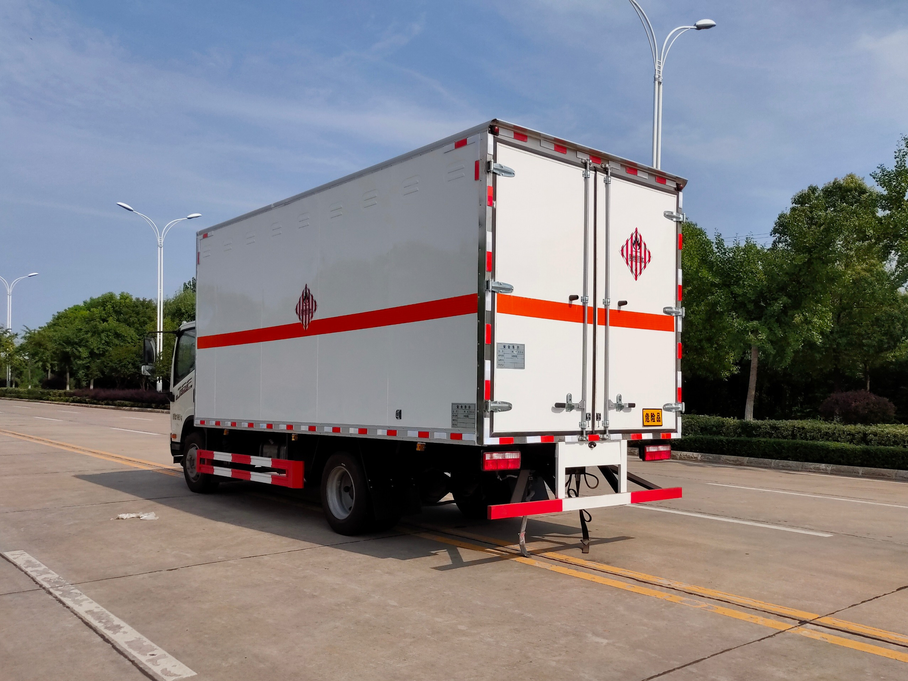 | 整车说明: | 该车适用于运输危险品。厢体顶部封闭,不可开启。运输具有独立容器包装的易燃固体,运输介质类别和项别号:4.1,4.2,4.3;侧/后防护材料为Q235,侧防护螺栓连接,后防护焊接连接,截面尺寸100×50mm,下边缘离地高460mm。3、采用3900mm轴距。选装驾驶室及底盘附件位置,选装左侧或右侧开门,侧门单开门、侧门双开门、侧不开门,选装侧门型式及位置,选装瓦楞板。液压尾板收起状态的水平长度为290mm,尾板质量为420kg.仅选用排气管前置、限速装置(限速80km/h)、前轮盘式制动及子午线轮胎的底盘;转向轮安装轮胎爆胎应急防护装置;安装带有卫星定位功能的行驶记录仪,可选装ETC车载装置;ABS生产厂家/型号:1.广州瑞立科密汽车电子股份有限公司/CM4XL-4S/4M;2.浙江万安科技股份有限公司/VIE ABS-II。发动机/油耗值(L/100km):WP3NQ160E61/21.3。选装不带液压尾板,不带液压尾板时,后防护焊接连接,截面尺寸120×50mm,下边缘离地高度460mm,选装后部样式。 | ||