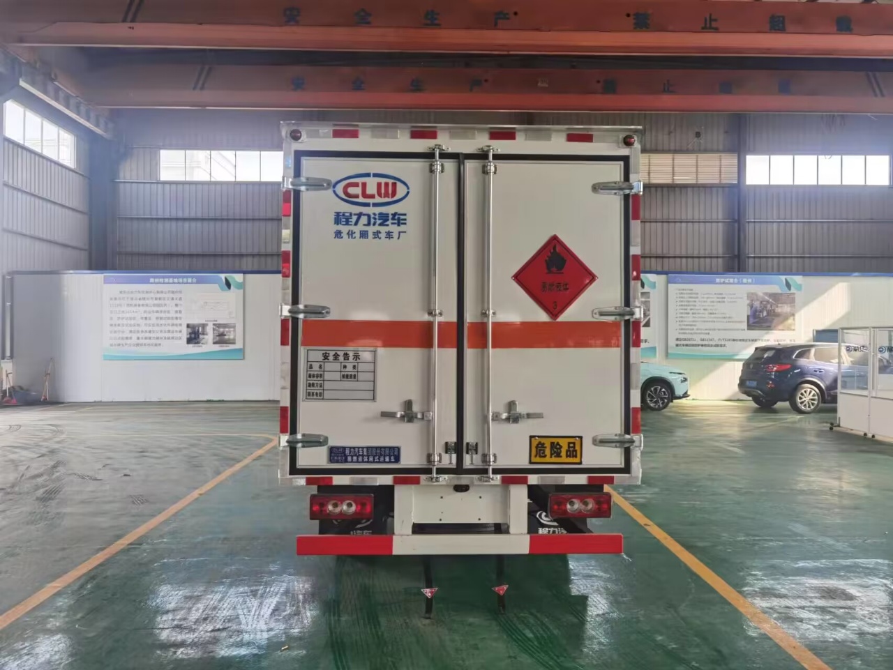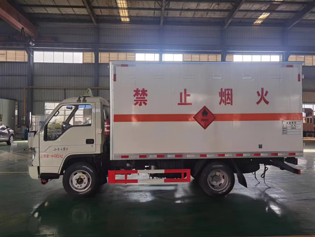 右开单侧门,厢体为双层金属骨架结构,外冷轧钢板内饰铝板,内壁采用铝合金板蒙面,夹层为隔热阻燃材料填充,厢体内部做通风窗口,厢体内部做防静电处理,厢体底部铺导静电胶板,车辆副梁配备导静电带,厢体内衬壁装单排卧环,厢体内顶部安装气体报警器,厢体安装防盗报警器,随车配备手提灭火器,危险品三角顶灯,防护帽等