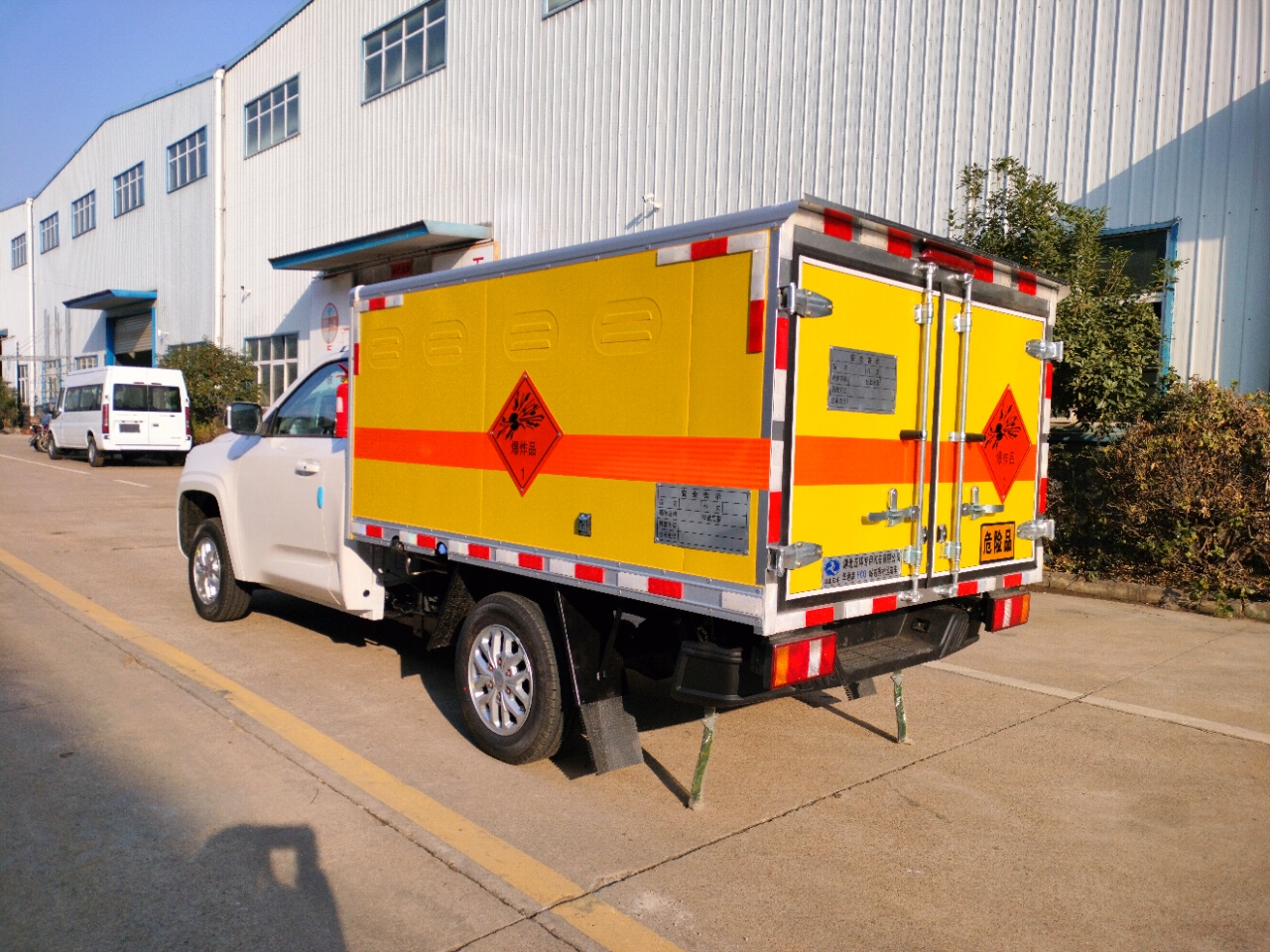 复合厢板:严格按照公告尺寸制作,外板采用1mm厚冷轧板有一次性成型的百叶窗,内饰为导电性能良好的铝板有透气孔,内衬为矩形管骨架牢靠稳定,内部填充为透气防潮阻燃的挤塑板,四种材料经现代工艺复合而成,厢体外部上下铝合金型材包边,底板和车厢前下部铺橡胶皮,后门双开,右侧前部单开门,严格按照危险品相关法规张贴 。