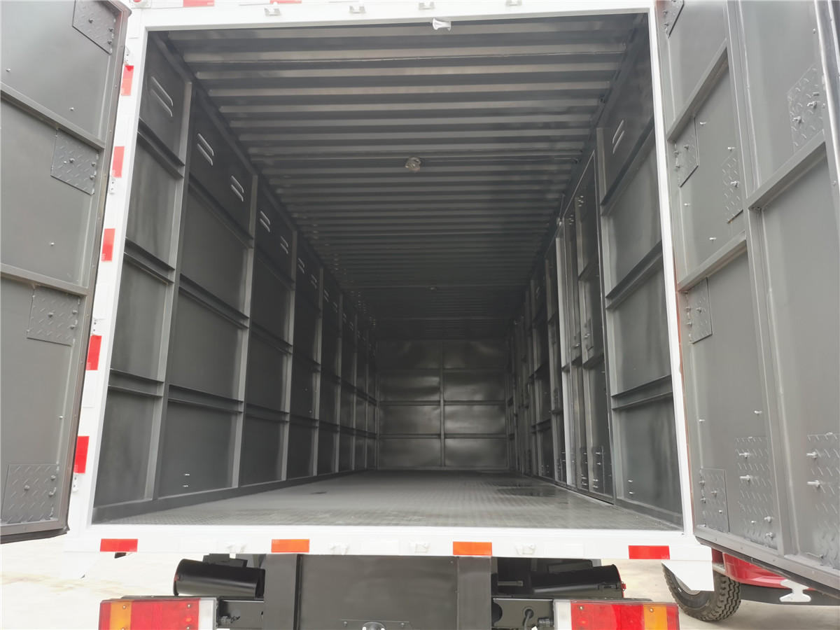 复合厢体结构:外板采用优质冷轧钢板带百叶窗,内饰为导电性能良好的铝平板有透气孔,矩形骨架结构内部填充防潮阻燃挤朔板,复合加铆合工艺。厢体四周铝合金包边及包角,车厢底板铺设防静电胶皮,厢体前脸50公分高铺设防静电胶皮。后部设置对开门,可选装侧门位置,厢体内部两侧安装捆绑货物的卧环。厢体内部安装气体感应器及防盗报警器。车厢一周粘贴橙色放光带,箱体粘贴 菱形告示牌,安全告示牌,可选装液压升降尾板。