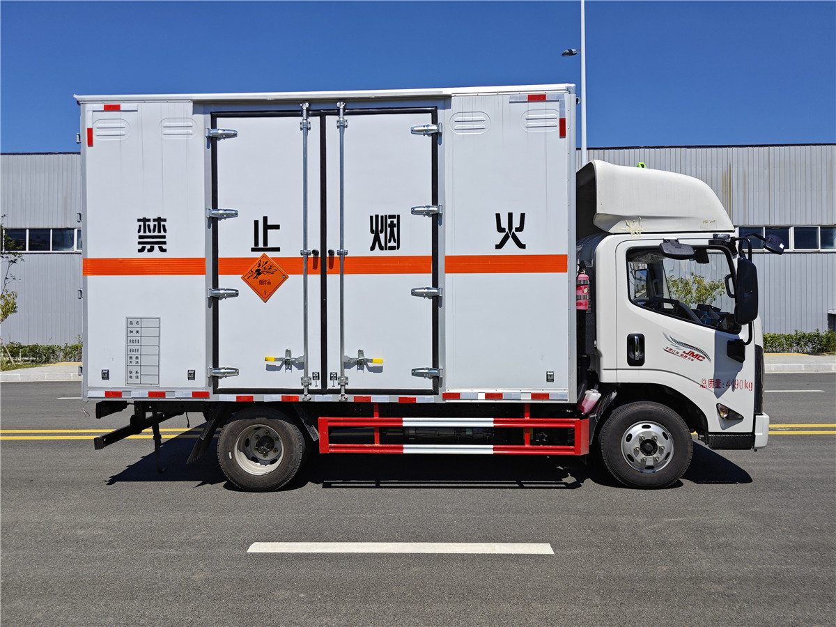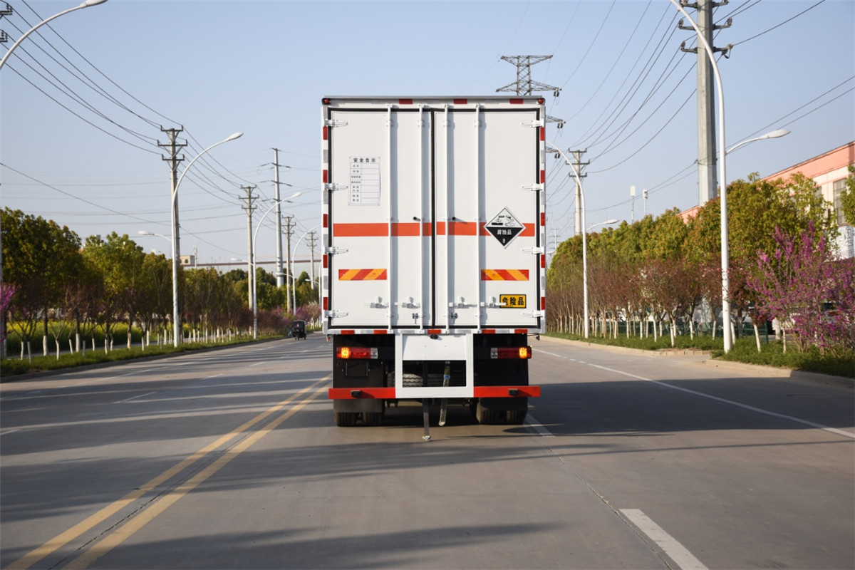 可选装瓦楞结构箱体,严格按照公告尺寸制作。复合板工艺:外板采用优质冷轧钢板,内饰为导电性能良好的铝平板有透气孔,矩形骨架结构内部填充防潮阻燃挤朔板,复合加铆合工艺。厢体四周铝合金包边及包角,车厢底板为平板铺设防静电胶皮,后部设置对开门,可选装侧门位置,厢体内部两侧安装捆绑货物的卧环。厢体内部安装烟雾报警器及防盗报警感应器。车厢一周粘贴橙色放光带,箱体粘贴 菱形告示牌,安全告示牌,危险品牌,箱体安装示廓灯(前白后红),拖地静电带。