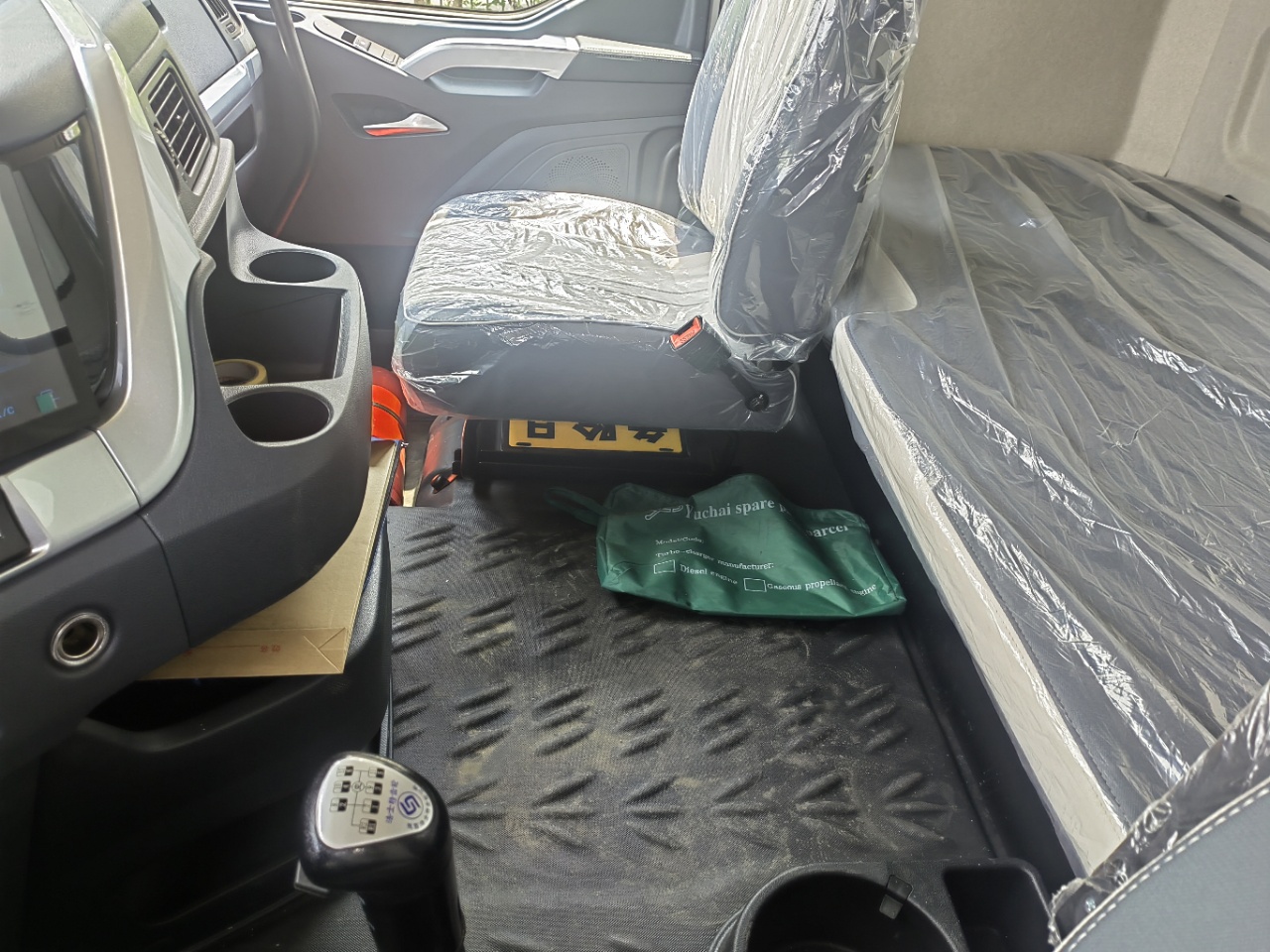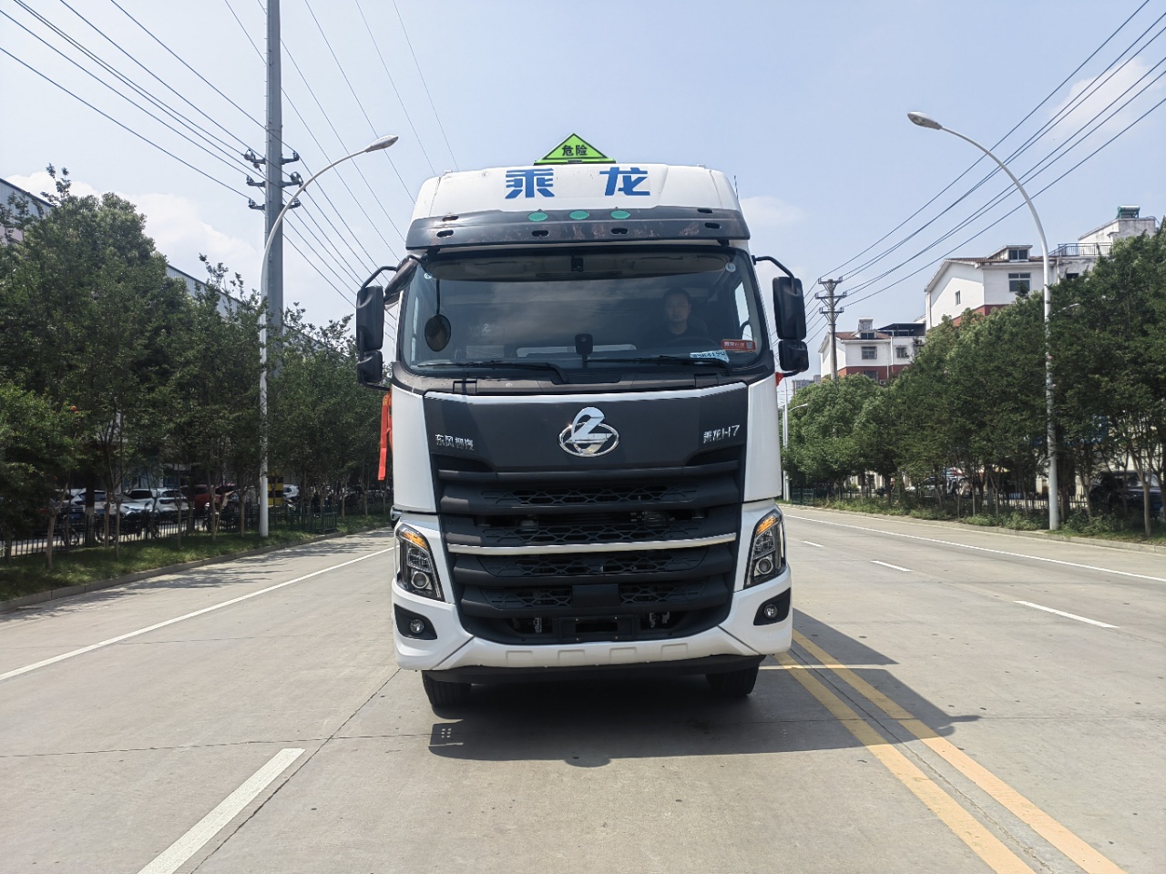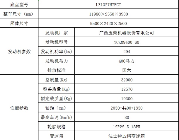 底盘配置:轴距2050+4400+1350,驾驶室H73S,发动机YCK09400-60,变速箱12JSD180TA(铝),离合Φ430国产拉式,前桥2*5.5T盘式,后桥2*440(14mm)/4.444/加宽制动器/油润滑,板簧3/3/-,车架282(8),400L(铝)油箱,国产方向机,12R22.5,前机械后气囊驾驶室悬置、电动液压翻转、针织气囊司机座椅、铝合金贮气筒、电控硅油风扇、10寸MP5+倒车影像、自动空调、皮质多功能方向盘、定速巡航系统、多态开关、电控硅油风扇、 AEBS、EBS、TPMS、LDWS、FCW、ESC、中控锁、ECU限速装置(限速80km/h)、导静电橡胶拖地带、驾驶室电源总开关、轻量化钢圈、右转提示音响、180AH电瓶、前置排气管、前轮防爆胎装置、盘式前桥、排气火花熄灭器、危险品运输顶灯