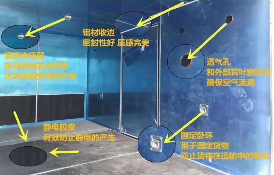 厢体配置:严格按照公告尺寸制作,外板采用1mm厚冷轧板有一次性成型的百叶窗,内饰为导电性能良好的铝板有透气孔,内衬为矩形管骨架牢靠稳定,内部填充为透气防潮阻燃的挤塑板,四种材料经现代工艺复合而成,厢体外部上下铝合金型材包边,底板和车厢前下部铺橡胶皮,后门双开,右侧两个双开门,内部有固定货物的卧环,车辆外部有静电带、灭火器、防火罩,车厢内安装烟雾报警器和门防盗报警器,严格按照危险品相关法规张贴